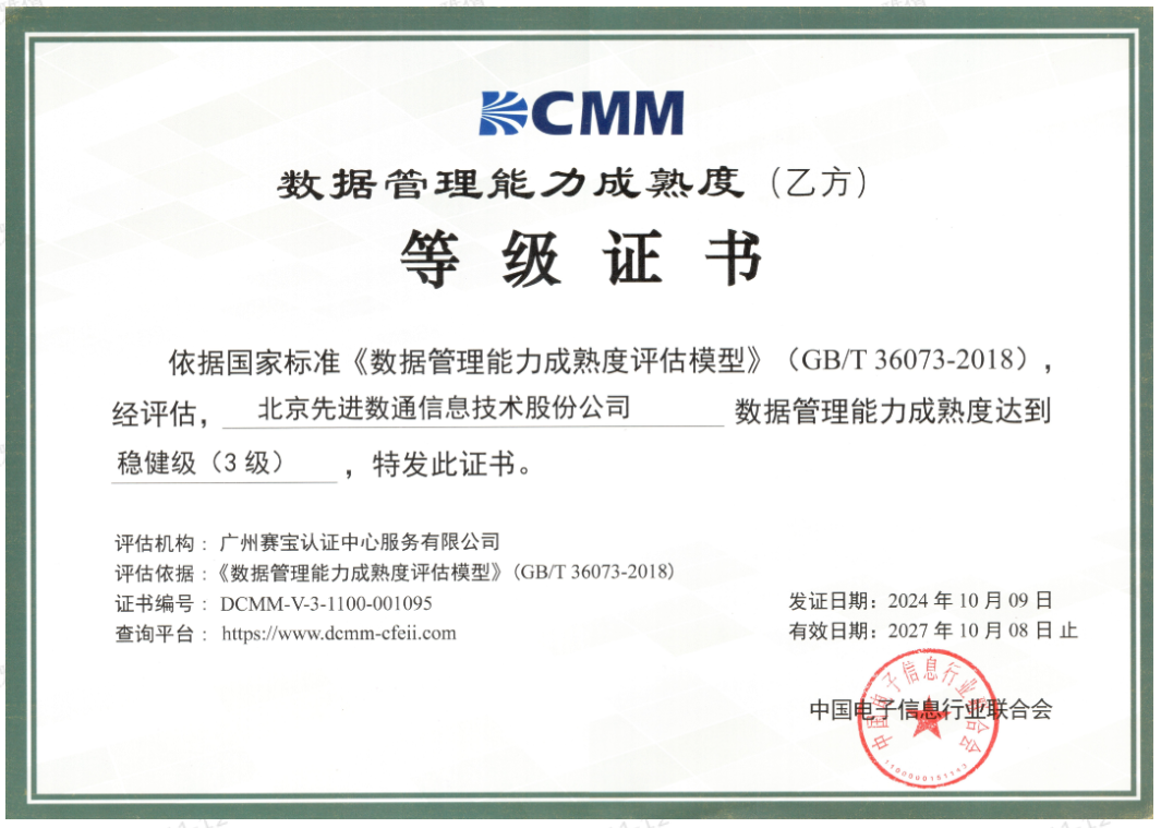 近期,中国电子信息行业联合会公布了最新一批顺利获得数据管理能力成熟度(DCMM)贯标等级认证的企业名单。球客岛APP(中国)成功取得数据管理能力成熟度稳健级(三级)认证。这一认证的取得,标志着球客岛APP(中国)在数据治理体系构建和数据管理与应用能力方面,已经达到了国家权威组织认可的标准。这不仅是对球客岛APP(中国)在数据管理领域专业能力的肯定,也是对其在有助于数字化转型服务和数据驱动决策方面所做努力的认可。